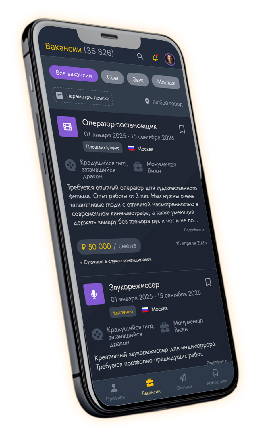 Ищете работу в кино? Используйте наше мобильное приложение для удобного поиска вакансий, управления заявками и отслеживания избранных предложений прямо с телефона: